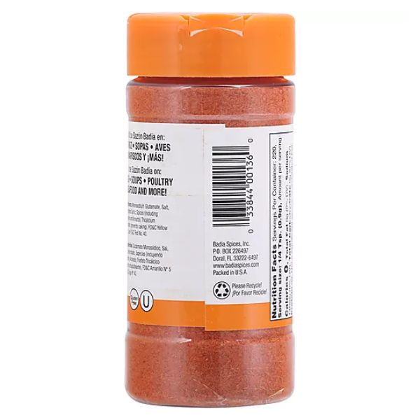 Badia Sazon Seasoning with Coriander & Annatto is a flavorful spice blend commonly used in Latin and Caribbean cuisines. It combines the earthy taste of coriander and the vibrant color of annatto to create an authentic seasoning perfect for rice, beans, meats, and vegetables.