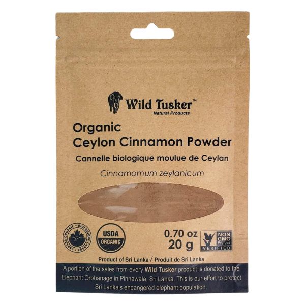 Wild Tusker Organic Ceylon Cinnamon Powder, 20g delivers premium quality and aromatic flavor in a compact resealable pack. Sourced from Sri Lanka, this 100% organic cinnamon is USDA-certified, non-GMO, and free from additives. Its sweet and mild taste makes it perfect for teas, baking, smoothies, and savory dishes.